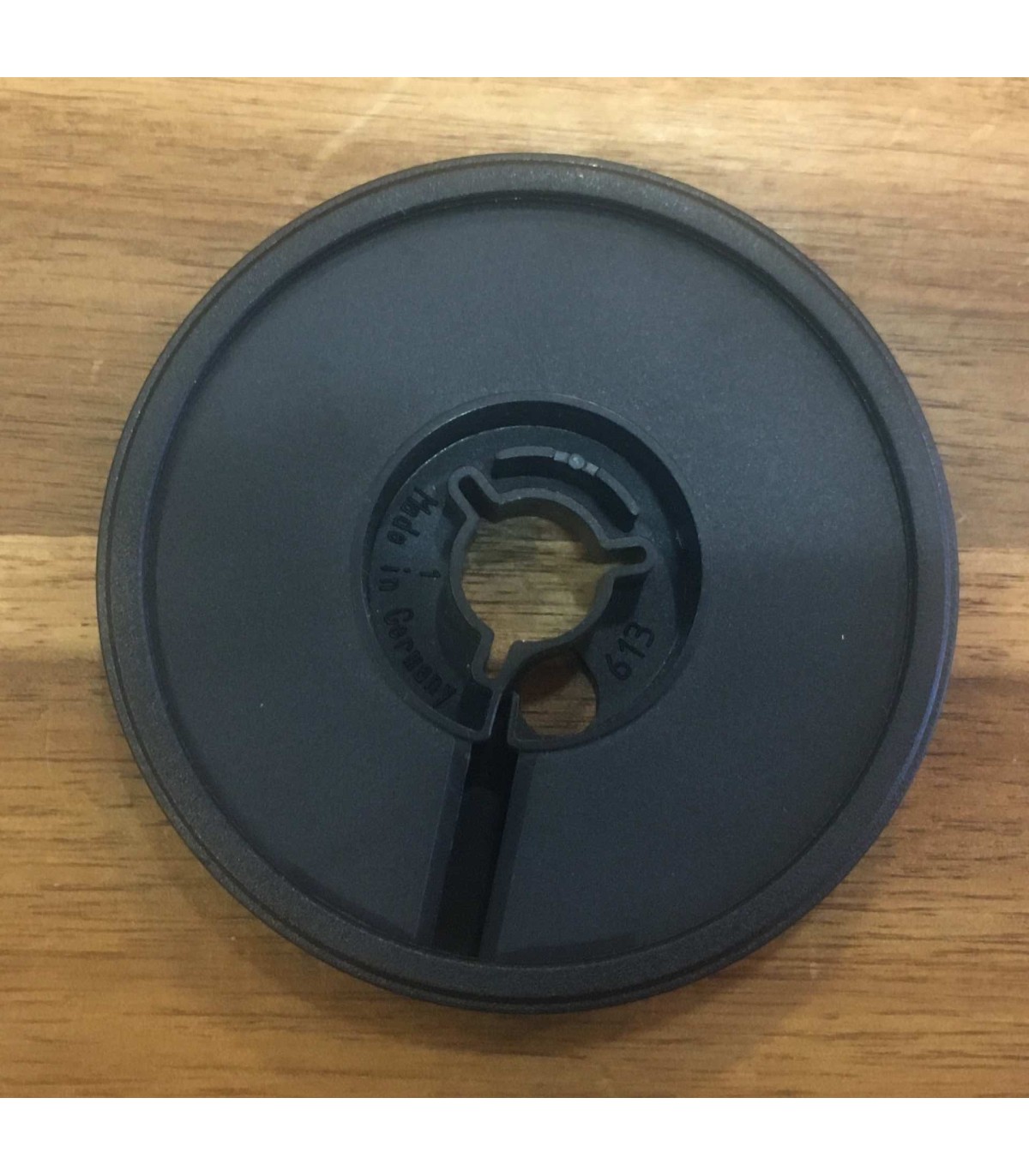 Bobineau en plastique de 15 m pour film Super 8 avec couvercle. Correspond à une cartouche Super 8. En plastique noir. Dimensions : 7,5 cm de diamètre. du stock recyclée. Peut présenter de légers signes d'usure.